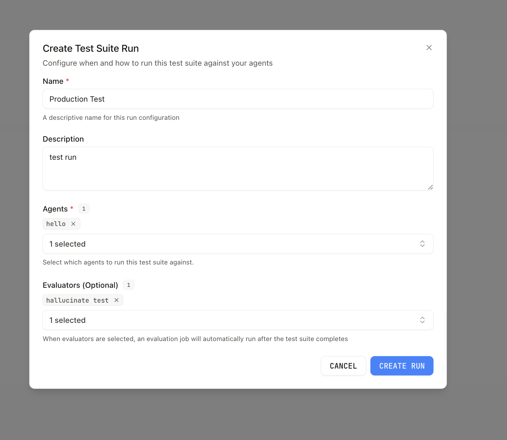 Create Test Suite Run dialog showing name, description, agent selection, and optional evaluators